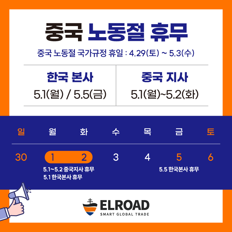 * Áß±¹ Áö»ç : 5/1(¿ù) ~ 5/2(È) ³ëµ¿Àý ÈÞ¹«